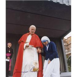 Color glossy 8 x 10 photo of the Holy Father holding the hand of Mother Teresa, signed in black felt tip, “Joannes Paulus II.” In very fin