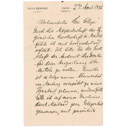 German physiologist (1854-1917) who received the 1901 Nobel Prize in Physiology or Medicine. ALS in German, signed “E. Behring,” one page