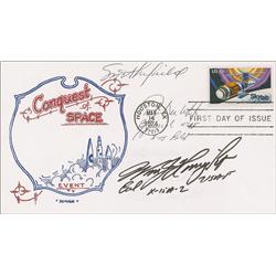 FDC with a cachet honoring the conquest of space, signed on the front in ballpoint and felt tip by Scott Crossfield, William 'Pete' Knight, ...