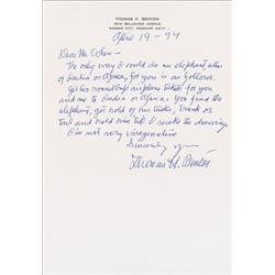 ALS signed “Thomas H. Benton,” one page, 7.5 x 10.5, personal letterhead, April 19, 1974. Letter to a gentleman inquiring about a sketch of an elephan