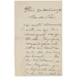 Rare and desirable ALS in French, one page both sides, 5.25 x 8.25, November 30, 1896. Cezanne writes Emile Solari. In full (translated): “I am so ver