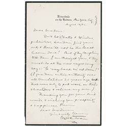 ALS signed “Mark Twain,” one page, 5 x 8, black-bordered Riverdale on the Hudson letterhead, August 14, 1902. Letter to Elisabeth Brachman in Norway.