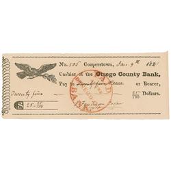 Bank check, 5.75 x 2.25, filled out and signed by Cooper, “J. Fenimore Cooper,” payable to Pease for $25.00, January 9, 1834. In fine condition, with