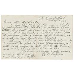 Beloved British author of Alice’s Adventures in Wonderland, better known by his pen name, Lewis Carroll (1832-1898). ALS signed “C. L. Dodgson,” one p