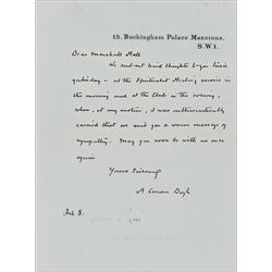 ALS signed “A Conan Doyle,” one page, 5.25 x 7, personal letterhead, February 8. Letter to Marshall Hall. In full: “We sent out kind thoughts to you t