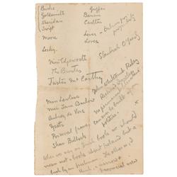 Unsigned pencil notes on a 4.5 x 7 off-white sheet. Doyle apparently is making notes for an essay or speech on Irish literature. He lists 21 names inc