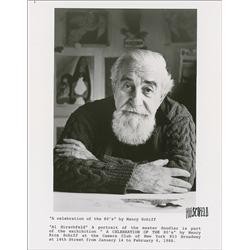 Glossy 8 x 10 photo of Hirschfeld, taken as part of a 1988 photo exhibit, signed in black felt tip, “Hirschfeld.” In very fine condition.