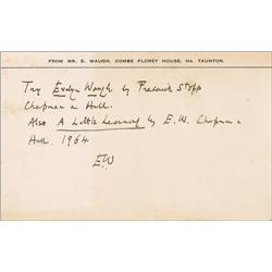 English writer (1903–1966) best known for darkly humorous and satirical novels. ALS signed “E. W.,” on one of his 5.5 x 3.5 personal postcards, no dat