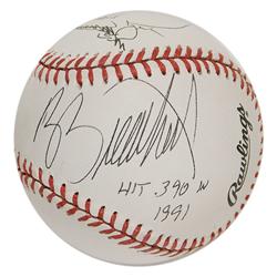 Official Rawlings National League baseball signed in black ballpoint, “B. Breathed, Hit .390 in 1991,” and adding a sketch of Opus on a side panel. In