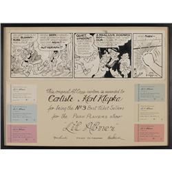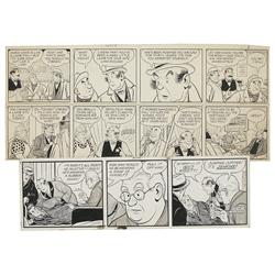 Original hand-inked three-panel Li’l Abner daily comic strip, dated May 16, on a 19.5 x 6 off-white sheet of artist’s cardstock, signed in ink in the
