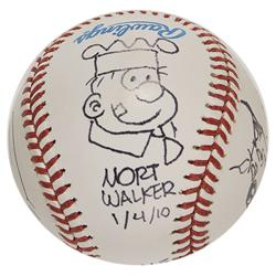 Official Rawlings American League baseball signed in ink and felt tip on the side panels by four different cartoonists, each adding a sketch of one of