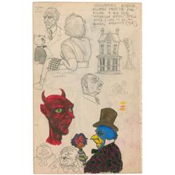 Original unsigned pencil and ink sketches on both sides of a 5.25 x 8 off-white page, most likely removed from a sketch book. First page is numbered “