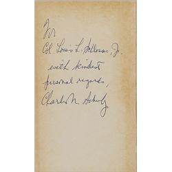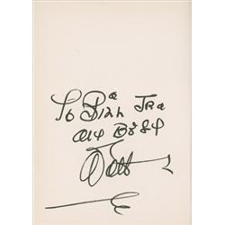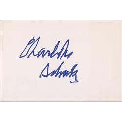 Felt tip signature, “Charles M. Schulz,” on an off-white 6 x 4 card. In fine condition, with a bit of mild edge toning.