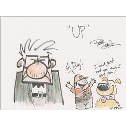 Original signed felt tip sketch of Carl Fredricksen, Russell, and Dug, from the movie Up, on a white 11 x 8.5 card. In very fine condition.