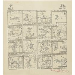 Depressing poster, 25 x 23, of a Life Is Hell comic strip, signed in the lower border in red felt tip, “Matt Groening 6/26/87,” adding a small bunny s