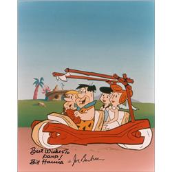 Two identical color glossy 8 x 10 photos of an animated scene from The Flintstones, each signed and inscribed in black felt tip by Bill Hanna and Joe