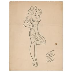 Original vintage signed and inscribed ink sketch of a voluptuous woman on an off-white 8.5 x 11 sheet, signed and inscribed “Happy landings to my good