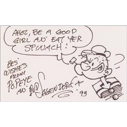 Original signed felt tip sketch of Popeye on a white 5 x 3 card, with Popeye saying “Ahoy, Be a good girl an’ eat yer spinach,” and signed at the bott