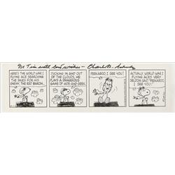 Original hand-inked four-panel Peanuts daily comic strip, ink on artist’s cardstock, 24 x 7, August 16, 1986, signed vertically in the last panel, “Sc