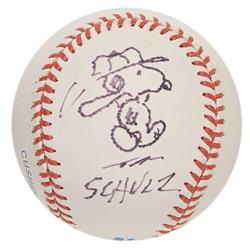 Official Rawlings American League baseball signed in black felt tip on a side panel, “Schulz,” adding a small full-length sketch of Snoopy swinging a