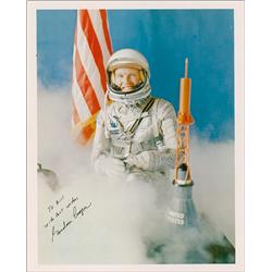 Color vintage 8 x 10 NASA photo of Cooper in his spacesuit, signed and inscribed in black ink “To Bill, with best wishes, Gordon Cooper.” Scattered cr