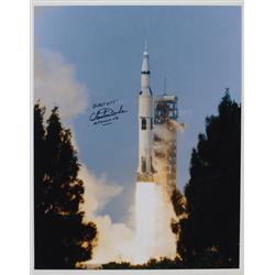 Exhilarating color satin-finish 16 x 20 photo, signed in black felt tip, “Blast off! Charlie Duke, Apollo 16.” In fine condition, with a few scattered