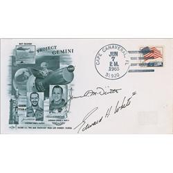 Commemorative cover with a cachet honoring the 1965 Gemini 4 mission, signed in black felt tip “James A. McDivitt” and “Edward H. White II.” In fine c