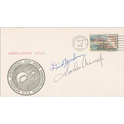 Commemorative cover with a cachet honoring NASA, signed on the front in blue ballpoint by Dick Gordon, and in black ballpoint by Charles Conrad. In fi