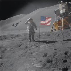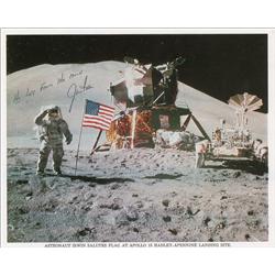 Color 10 x 8 NASA photo of Irwin saluting the American flag on the surface of the moon, signed in black felt tip, “His love from the Moon, Jim Irwin.”