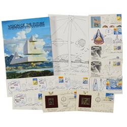Fourteen signed items, 13 of which bear original artwork: a hardcover edition of Vision of the Future, signed on the inside front cover with a magnifi