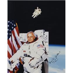 Color glossy 16 x 20 composite photo of McCandless in his Manned Maneuvering Unit , signed in black felt tip, “Bruce McCandless II, STS-41B.” In fine