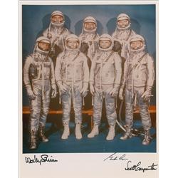 Color glossy 8 x 10 photo of the Mercury astronauts posing in their spacesuits, signed in the lower border in black felt tip by Wally Schirra, Gordon