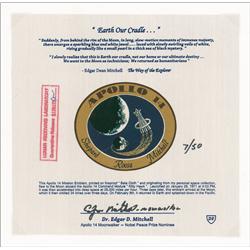 Copy number 7/50 beta cloth mission emblem, 9 x 8.75, from the unique Apollo 14 flown limited edition entitled “Earth Our Cradle.” Flown to lunar orbi