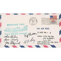 Commemorative cover with a cachet honoring the Boeing 747, the Space Shuttle aircraft, signed on the front in black ink by Fitz Fulton, A. J. Roy, Ski