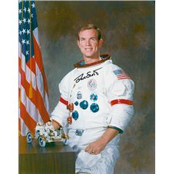 Color glossy 8 x 10 photo of Scott in his space suit posing with a model of a lunar rover, signed in black felt tip. In very fine condition.