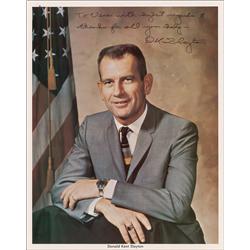 Color vintage 8 x 10 NASA photo of Slayton in a jacket and tie, signed and inscribed in black felt tip “To Vera with highest regards & thanks fo...