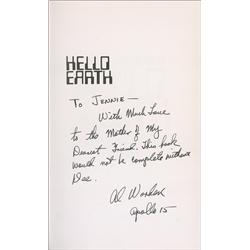 Signed book: Hello Earth. First edition, first printing. Los Angeles: NASA Publishing, 1974. Hardcover with dustjacket, 6 x 9, 80 pages. Singed on the
