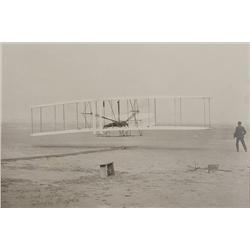 Fabulous vintage matte-finish 9 x 6 oversized photo of the Wright Brothers first flight, signed and inscribed in black ink “To Elizabeth Payne, with b