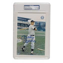 Color 5 x 7.5 photo of a young Mantle taking a practice swing in his road uniform, signed in blue felt tip. Encapsulated in a plastic PSA/DNA authenti