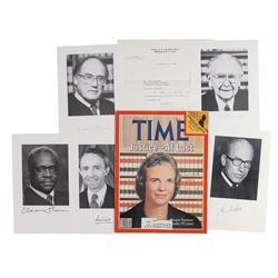 Seven items: five 6 x 9 paperstock official portraits individually signed in ink by William Rehnquist, William J. Brennan, David Souter, Clarence Thom