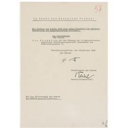 War-dated DS, in German, signed “A. Hitler,” one page, 8.25 x 11.75, February 19, 1942. Document promoting Georg von Bismarck as major general of the