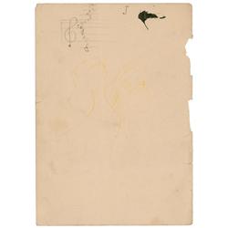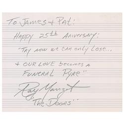 AQS in pencil on an off-white 8.5 x 7 musically-lined sheet. Manzarek pens a line from ‘Light My Fire,’ a song he co-wrote with Morrison. In full: “To