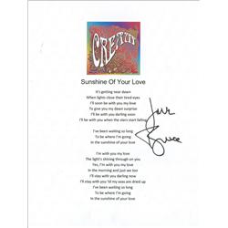Printed souvenir lyrics to ‘Sunshine of Your Love’ by Cream, 8.5 x 11 signed in black felt tip along the right side by Jack Bruce. In very fine condit