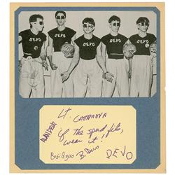 Early in-person felt tip signatures, “Alan Devo,” “Lt. Casanova,” “B. Devo,” and “Booji Boyxo,” on a yellow 5 x 3 card, with one member adding the ban