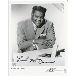 Glossy 11 x 14 full-length photo, signed in black felt tip, “Luck, Fats Domino.” In very fine condition.