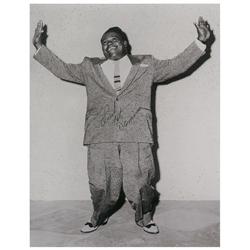 Vintage glossy 10 x 8 photo of Calloway in a tuxedo, signed later in blue felt tip. In very good condition, with scattered creases, scratches, surface