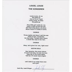 Printed souvenir lyrics to ‘Louie, Louie’ by The Kingsmen, 8.5 x 9, signed in blue ballpoint at the bottom by Jack Ely. In fine condition with a few l