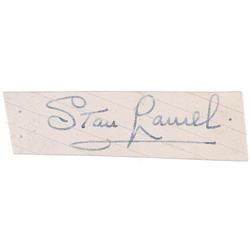 Vintage fountain pen signatures “Stan Laurel,” and “Oliver Hardy,” on individual clipped off-white lined cards, both measuring approximately 3.5 x 1.