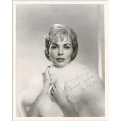 Vintage matte-finish 8 x 10 photo of Leigh wrapped in a fur, signed and inscribed in blue ballpoint “To Tommy, Kindest regards–Janet Leigh.” In fine c