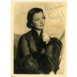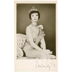 Vintage matte-finish 5 x 8 photo of an elegantly dressed Leigh wearing a tiara, signed in black ballpoint along the bottom white border. In fine condi